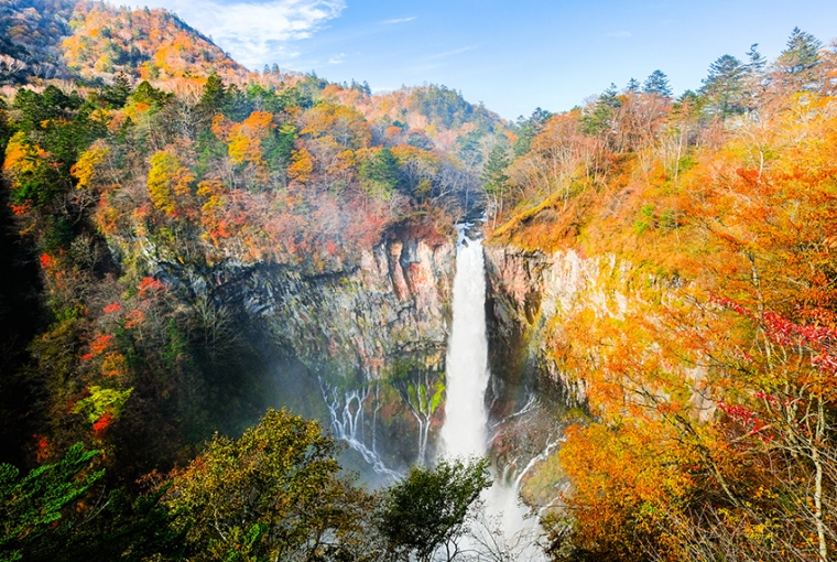 【華嚴瀑布】(紅葉預估時間10月中旬~11月上旬)華嚴瀑布形成的原因是中禪寺湖水壓過大,造成湖底漏水,使湖水從97公尺高度的岩石陡壁之上傾瀉而下,瀑布聲勢浩大,能感受到大自然撼動人心的力量和神奇的造物之美。與茨城縣「袋田瀑布」、和歌山縣「那智瀑布」並稱為日本三大名瀑。