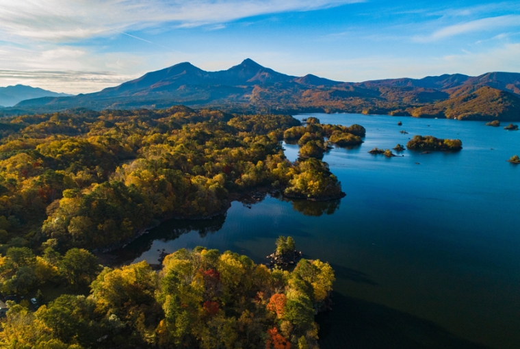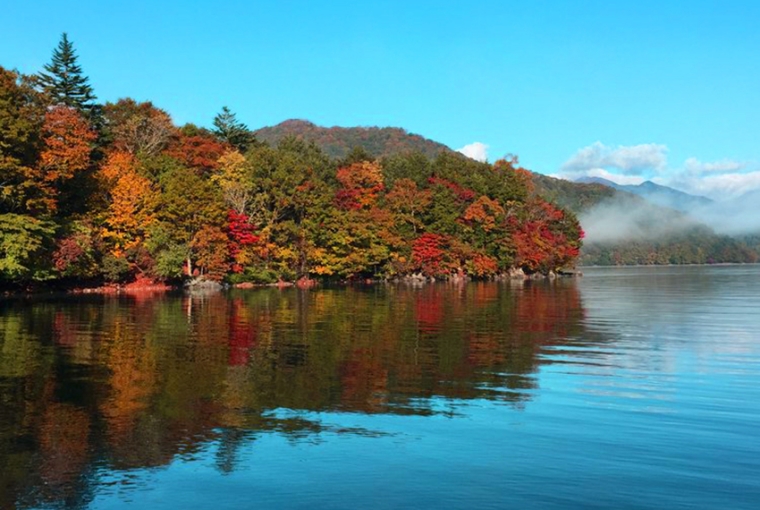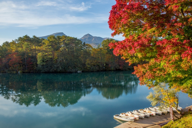 【檜原湖遊船】(紅葉預估時間10月中旬~11月上旬)位在福島縣的檜原湖是由磐梯山火山爆發而形成,湖周約31公里,是裏磐梯最大的湖泊,設有環湖道路,沿途可以欣賞豐富的四季風光,是非常熱門的兜風景點。湖上有遊覽船和電動艇行駛,能走訪湖上美麗島嶼及磐梯山爆裂口痕跡等,感受大自然的力量。