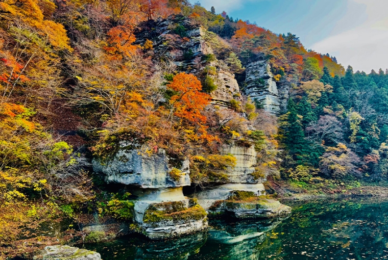 【塔崖】(紅葉預估時間10月下旬~11月中旬)約100萬年前經過阿賀川的侵蝕與風化作用而形成彷彿高塔一般聳立的斷崖,如此特殊景觀,在1943年被指定為國家天然紀念物。四季皆可欣賞不同美景,秋季紅葉時節最為人喜愛,夏季新綠的景致也非常值得到訪,景色宛如優美的名畫。
